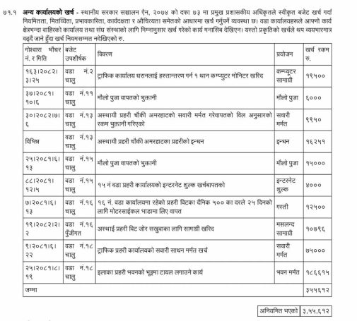 धरान । स्थानीय तहमा आर्थिक अनुशासन र पारदर्शितामाथि गम्भीर प्रश्न उठ्ने गरी विभिन्न वडा कार्यालयहरूले नियमविपरीत लाखौं रुपैयाँ खर्च गरेको पाइएको छ । महालेखापरीक्षण प्रतिवेदनले स्थानीय सरकार सञ्चालन ऐन, २०७४ को स्पष्ट उल्लंघन गर्दै ट्राफिक प्रहरी, अस्थायी प्रहरी चौकी तथा अन्य संस्थाका लागि बजेट खर्च गरिएको औंल्याएको हो । उक्त ऐनको दफा ७३ अनुसार स्वीकृत बजेट खर्च गर्दा नियमितता, मितव्ययिता,...