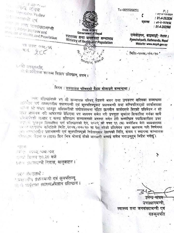 उपकुलपति रौनियारले २४ घण्टे स्पस्टीकरणसँगै दुई पटक सिनेट बैठक बोलाउन दिएको निर्देशन समेत उल्लंघन गर्दै शक्ति केन्द्र धाउने गरेको प्रतिष्ठान स्रोतले जानकारी दिएको छ । स्वास्थ्य मन्त्रालयले कार्तिक २० गते पत्राचार गरी मंसिर ५ गते सिनेटको बैठक बोलाउन र दोस्रो पटक १६ गते बोलाउन निर्देशन दिएको थियो । सञ्चालक परिषदको बैठक बोलाउने सम्बन्धमा मन्त्रालयद्वारा जारी निर्देशनमा भनिएको छ, प्रतिष्ठानको ४१ औं सञ्चालक परिषद्को बैठकले भवन तथा उपकरण खरिद सम्बन्धमा अध्ययन भई सम्माननीय प्रधानमन्त्री एवम् कुलपतिबाट प्रधानमन्त्री तथा मन्त्री परिषद कार्यालयका सचिव केदारबहादुर अधिकारीको संयोजकत्वमा गठित छानविन कार्य दलले दिएको प्रतिवेदन र सो उपर अध्ययन गरी उपयुक्त सुझाव सिफारिस गर्नका साथै प्रतिवेदनका आधार र समग्र प्रतिष्ठानको ऐन २०४९ को दफा ११ (घ) बमोजिम मेरो अध्यक्षतमा कार्तिक २० मा पेश गरेको प्रतिवेदन उपर छलफल गरी निर्णयमा पुग्न प्रधानमन्त्रीको निर्देशन अनुसार सञ्चालक समितिको बैठक ७ दिनभित्र बोलाउन स्वास्थ्य मन्त्रीले निर्देशन दिएका थिए । तर रौनियारले सञ्चालक समितिको बैठक बोलाउन हालसम्म आलटाल गर्दै आएका छन् । मन्त्रालय स्रोतले दिएको जानकारी अनुसार रौनियारले २ पटक सिनेट बोलाउन दिएको निर्देशन अवज्ञा गर्नु निजकै लागि प्रतिकूल हुने बतायो । छानविन समितिका संयोजक एवम् स्वास्थ्य मन्त्रालयका सचिव केदारबहादुर अधिकारीले भन्नुभयो अब प्रधानमन्त्रीको निर्देशनमा स्वास्थ्यमन्त्री उपेन्द्र यादवले नै सिनेट बोलाउन पत्राचार गर्नु हुन्छ ।