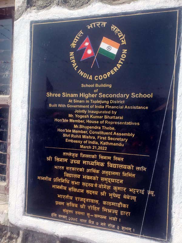 फुङलिङ (ताप्लेजुङ) । ताप्लेजुङ जिल्लाको उत्तरपूर्वी (भारत र चीनसँग सीमा जोडिएको) साविकको सिनाम गाउँ पालिकामा भारत सरकारको अनुदान सहयोगमा निर्माण सम्पन्न भएको नवनिर्मित सिनाम उच्च माध्यामिक विद्यालय भवनको सोमबार एमाले सांसद योगेश भट्टराई, संविधानसभा सदस्य भुपेन्द्र थेवे र नेपाल स्थित भारतीय राजदुतावासका प्रथम सचिव रोहित मिश्राले संयुक्त रुपमा समुद्घान गर्नुभएको छ ।