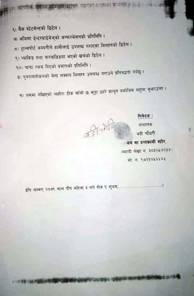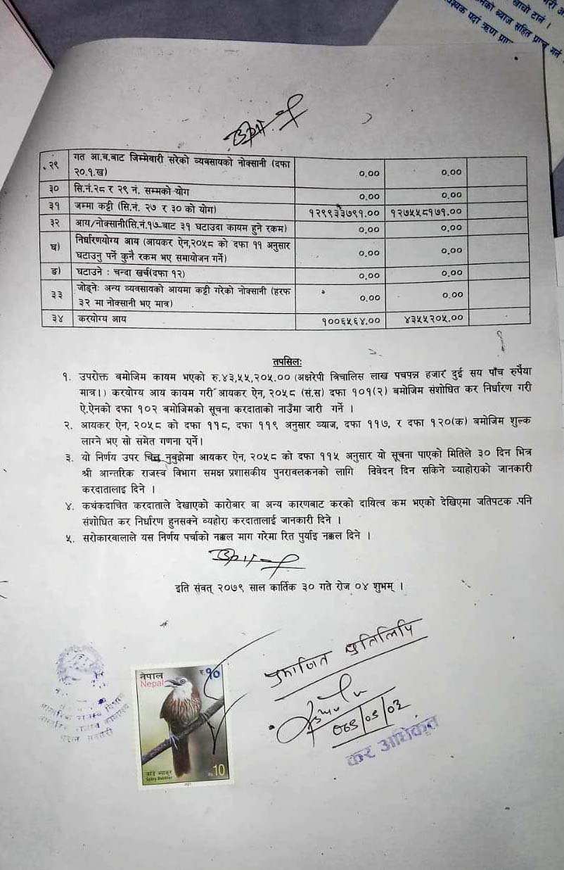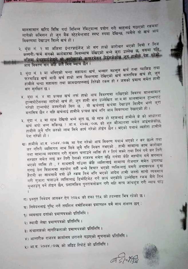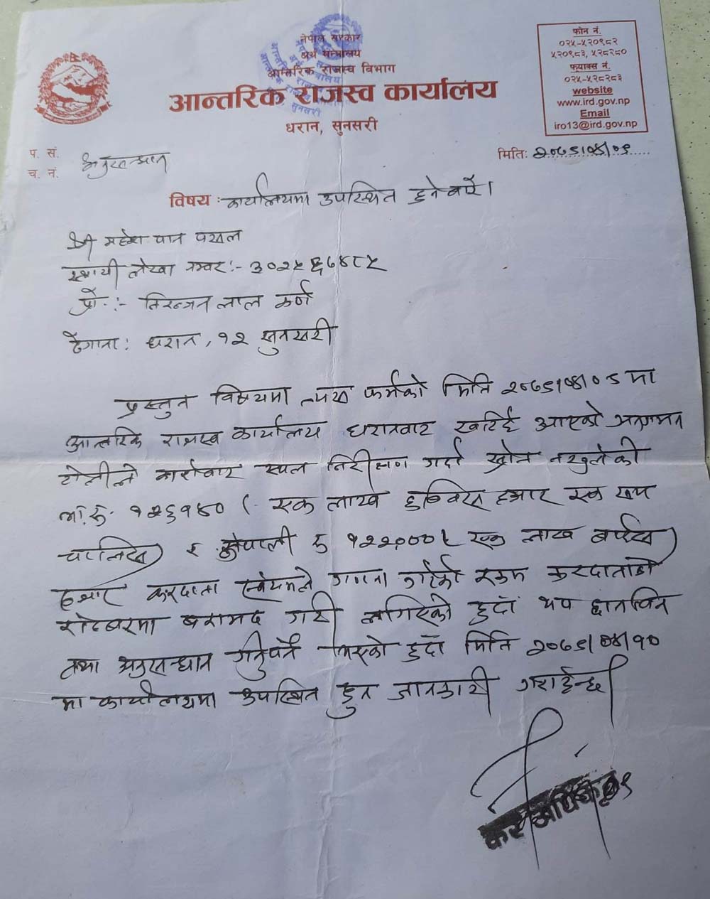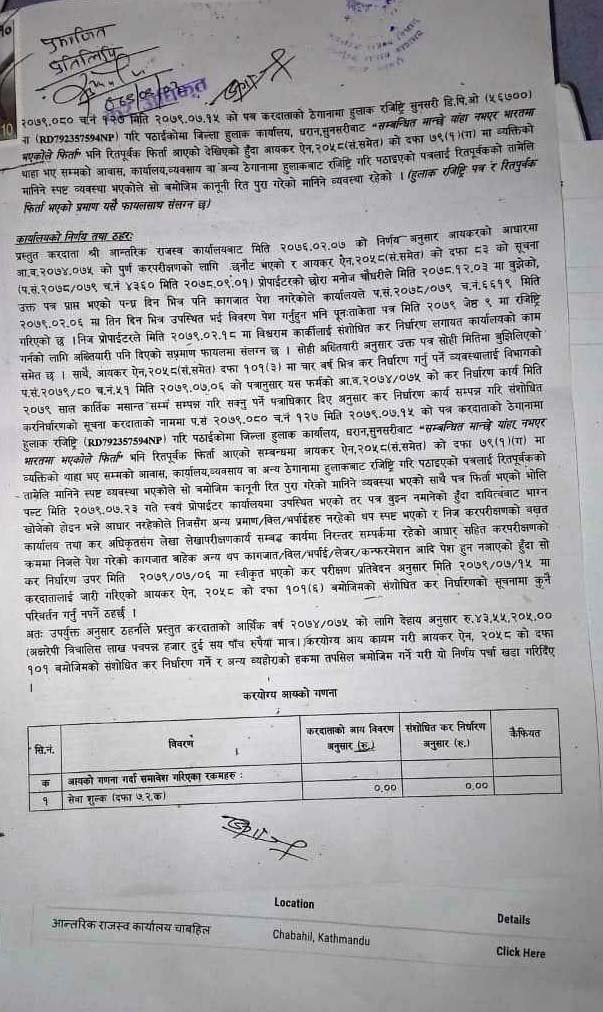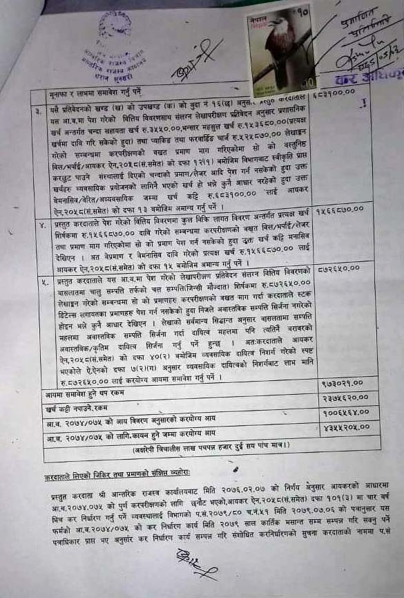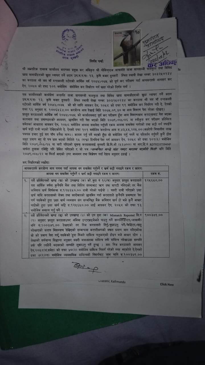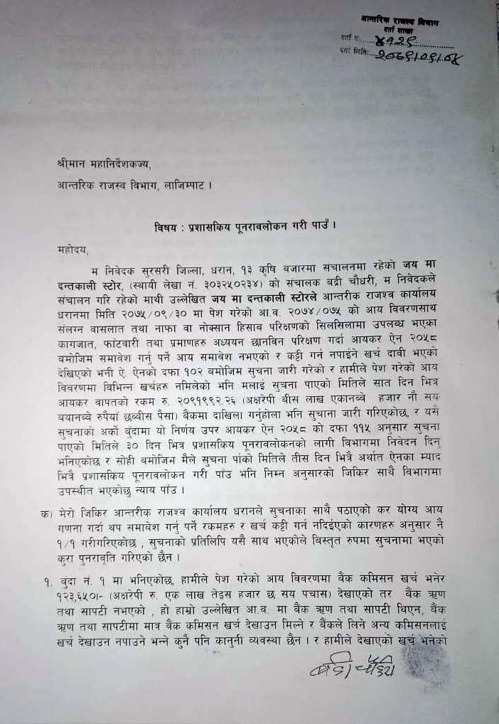 आयकर ऐन २०५८ को दफा १०६ बमोजिम पत्र कार्यालय प्रमुख आचार्यकै निर्देशमा कर अधिकृत प्रकाश राईले काटेका थिए । ती सब्जी व्यवसायीले भने राईले फोन गरेर कार्यालयमा बोलाए । तपाईको २०७४÷०७५ को हिसाब मिलेको छैन । यसका लागि ५०÷६० लाख सम्म तिुर्नपर्न हुन्छ भन्दा ती सब्जी व्यवसायी धेरैबेर आन्तरिक राजस्व कार्यालयमा कार्यालय प्रमुखका अगाडि रुहेका थिए । सानो तिनो व्यापार व्यवसाय गरेर खानेले यतिका पैसा कहाँबाट तिुर्न भन्दै उनले विलौना पोखेका थिए । अन्त्यमा ती स्रब्जी व्यवसायीबाट रकम नझर्ने देखेपछि कार्यालय प्रमुख आचार्यले अब आफू केही गर्न नसक्ने, दफा १०६ बमोजिम पत्र काटेपछि आफ्नो हातखुट्टा बाँधिएको हुन्छ भन्दै प्रशासकीय पुनरावोकन गर्न काठमाण्डौ जान सुझाव दिएको ती सब्जी व्यवसायीले सुनाए । ती सब्जी व्यवसायीलाई २० लाख ९१ हजार ९९६ रुपैया २६ पैसा फाइन र जरिवानासहितको पत्र पश्चात धरानका व्यवसायी र राजस्वविद् कृष्णकुमार आग्रवाल, प्राध्यापक डा. अशोक झा भन्नुहुन्छ, टार्गेटको नाममा ज्यादति गर्न पाइँदैन । व्यवसायीको व्यवसायको प्रकृति हेरेर पत्र काट्न सकिन्थ्यो । उहाँले भन्नुभयो पाँच बर्ष सम्म आन्तरिक राजस्व कार्यालय के हेरेर बसेको थियो ? पाँच बर्ष अगाडिको बिल भौचर खातापाता कस्ले राख्छ ? सरकारले पनि राख्नु नपर्ने जनाएको छ । हाल ती सब्जी व्यवसायीले काठमाण्डौ पुगेर प्रकाशकीय पुनरावोकन गरेका छन् । पुनरावोलकन गर्नका लागि पत्रमा उल्लेख गरिएको २५ प्रतिशत