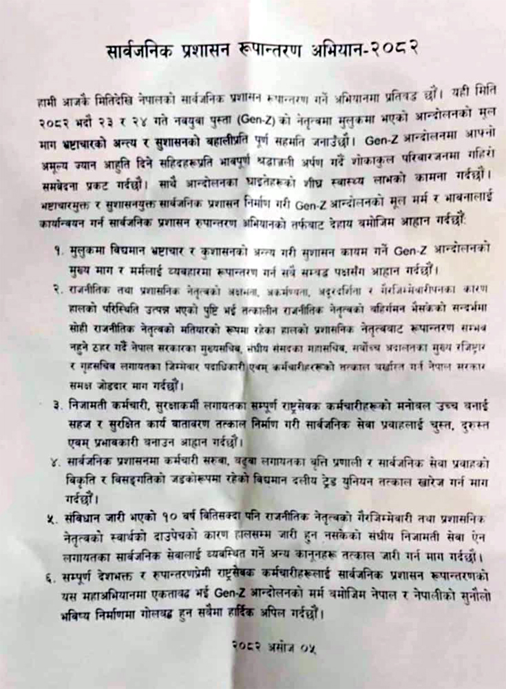उहाँले भन्नुभयो, ‘हाम्रो आन्दोलन पूर्ण भएको छैन । निकट भविष्यमा थप शक्तिशाली आन्दोलनको तयारीमा जेनजीहरू रहेका छन् ।’यसैबीच निजामती कर्मचारीहरूमा समेत २८ वर्ष मुनिका समेटिने गरी जेनजी कर्मचारी समूह गठनको गृहकार्य भइरहेको संयोजक यादवले जानकारी दिनुभयो । सार्वजनिक प्रशासन रूपान्तरण अभियान २०८२ नाम दिइएको उक्त अभियानको मूल उद्देश्य जेनजी कर्मचारी समूह गठन नै रहेको उहाँले बताउनुभयो । असोज ५ गते जेनजी समूहले एक विज्ञप्ति प्रकाशित गरी सार्वजनिक प्रशासन रूपान्तरण अभियान २०८२ का उद्देश्यहरूबारे प्रष्ट पारेको छ । प्रकाशित विज्ञप्ति अनुसार उनीहरूले भनेका छन्, ‘हामी आजकै मितिदेखि नेपालको सार्वजनिक प्रशासन रूपान्तरण गर्ने अभियानमा प्रतिबद्ध छौं । यही मिति २०८२ भाद्र २३ र २४ गते नव युवा पुस्ता जेनजीको नेतृत्वमा मुलुकमा भएको आन्दोलनको मूल माग भ्रष्टाचार अन्त्य र सुशासनको पक्षप्रति पूर्ण सहमति जनाउँछौं । जेनजी आन्दोलनमा आफ्नो अमूल्य ज्यान आहुति दिने शहीदहरूलाई भावपूर्ण श्रद्धाञ्जली अर्पण गर्दै शोकाकुल परिवारजनमा गहिरो समवेदना प्रकट गर्दछौं । साथै आन्दोलनका घाइतेहरूको शीघ्र स्वास्थ्य लाभको कामना गर्दछौं ।’ भ्रष्टाचारमुक्त र सुशासनयुक्त सार्वजनिक प्रशासन निर्माण गरी जेनजी आन्दोलनको मूल मर्म र भावनालाई कार्यान्वयन गर्न सार्वजनिक प्रशासन रूपान्तरण अभियानको तर्फबाट ६ बुँदे आह्वान समेत गरेको छ । ६ बुँदे आह्वान अन्तर्गत मुलुकमा विद्यमान भ्रष्टाचार र कुशासनको अन्त्य गरी सुशासन कायम गर्न सबै सम्बद्ध पक्षलाई आह्वान, राजनीतिक तथा प्रशासनिक नेतृत्वको अक्षमता, अकर्मण्यता, अदूरदर्शिता र गैरजिम्मेवारी पनका कारण हालको परिस्थिति उत्पन्न भएको पुष्टि भई तत्काल राजनीतिक नेतृत्वको बहिर्गमन भइसकेको सन्दर्भमा सोही राजनीतिक नेतृत्वको मतियारको रूपमा रहेको हालको प्रशासनिक नेतृत्वबाट रूपान्तरण सम्भव नहुने ठहर गर्दै नेपाल सरकारका मुख्य सचिव, संघीय संसद्का महासचिव, सर्वोच्च अदालतका मुख्य रजिष्ट्रार र गृह मन्त्रालयका जिम्मेवार पदाधिकारी एवं कर्मचारीहरूको तत्काल बर्खास्तीको जोडदार माग गरिएको छ । यसैगरी निजामती कर्मचारी, सुरक्षाकर्मी लगायत सम्पूर्ण राष्ट्रसेवक कर्मचारीहरूको मनोबल उच्च बनाई सहज र सुरक्षित कार्य गर्ने वातावरण तत्काल निर्माण गरी सार्वजनिक सेवा प्रवाहलाई चुस्त, दुरुस्त एवं प्रभावकारी बनाउनुपर्ने, सार्वजनिक प्रशासनमा कर्मचारी सरुवा, बढुवा लगायतका वृत्ति प्रणाली र सार्वजनिक सेवा प्रवाहको विकृति विसंगतिको जडको रूपमा रहेको विद्यमान दलीय ट्रेड युनियन तत्काल खारेज गर्नुपर्ने, संविधान जारी भएको १० वर्ष बितिसक्दा पनि राजन