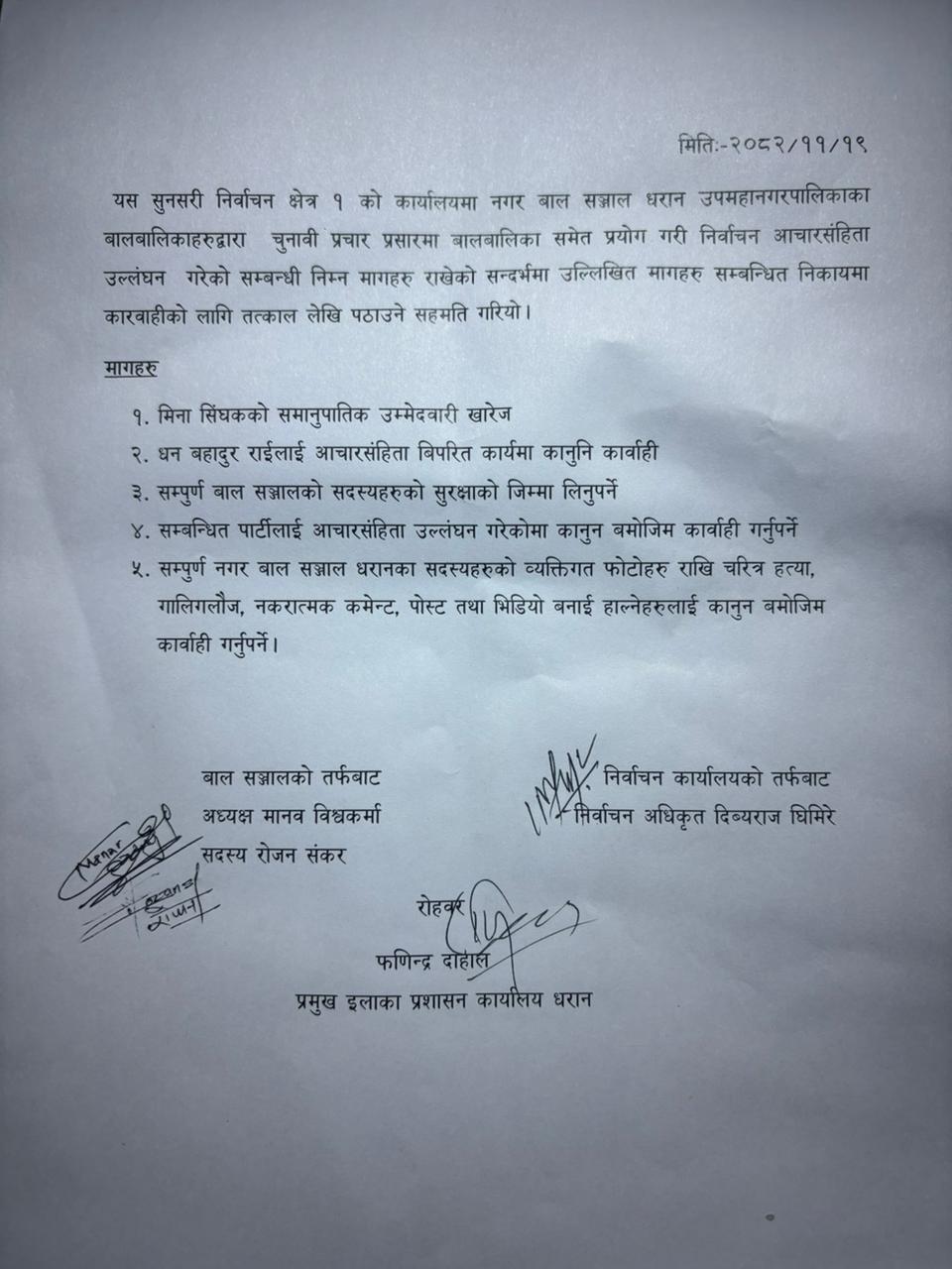 ज्ञापनपत्रमा निर्वाचन आचारसंहिताको गम्भीर उल्लंघन गरेको ठहर गर्दै मिना सिंघकको समानुपातिक उम्मेदवारी खारेज गरिनुपर्ने, धनबहादुर राईमाथि प्रचलित कानुनअनुसार कडा कारबाही गर्नुपर्ने, चुनावी प्रक्रियामा मुछिएका सम्पूर्ण बाल सञ्जाल सदस्यहरूको सुरक्षाको जिम्मेवारी राज्यले लिनुपर्ने, आचारसंहिता उल्लंघन गर्ने सम्बन्धित राजनीतिक दललाई कानुनी दायरामा ल्याउनुपर्ने तथा बालबालिकाको तस्बिर दुरुपयोग गरी सामाजिक सञ्जालमा चरित्र हत्या, गालीगलौज र नकारात्मक सामग्री पोस्ट गर्ने व्यक्तिहरूको पहिचान गरी कारबाही गर्नुपर्ने माग राखिएको थियो । निर्वाचन आचारसंहिताले बालबालिकालाई कुनै पनि प्रकारको राजनीतिक प्रचार–प्रसारमा प्रयोग गर्न स्पष्ट निषेध गरेको छ । बालबालिकालाई चुनावी अभियानमा प्रयोग गर्नु उनीहरूको नैसर्गिक अधिकारको हनन भएको सञ्जालले जनाउदै आएको थियो । विशेषगरी सामाजिक सञ्जालमार्फत बालबालिकाको चरित्र हत्या गर्ने जस्तो कार्यले सुरक्षाको कमजोर अवस्था उजागर गरेको छ । उक्त मागहरूमाथि निर्वाचन कार्यालय सुनसरी क्षेत्र नं. १ ले सम्बन्धित माथिल्लो निकायमा कारबाहीका लागि तत्काल पत्राचार गर्ने प्रतिबद्धता जनाएको छ । सहमति पत्रमा बाल सञ्जालका तर्फबाट अध्यक्ष मानव विश्वकर्मा र सदस्य रोजान संकरले हस्ताक्षर गरेका छन् भने निर्वाचन अधिकृत दिव्यराज घिमिरेले कानुनी प्रक्रिया अगाडि बढाउने विश्वास दिलाउनु भएको छ ्। यो घटनाले आगामी दिनमा निर्वाचनमा बालबालिकाको प्रयोग गर्ने दल तथा उम्मेदवारहरूलाई कडा सन्देश दिएको छ । अब निर्वाचन आयोगले यस विषयमा कस्तो ठोस कदम चाल्छ भन्ने विषयमा चासो बढेको छ ।